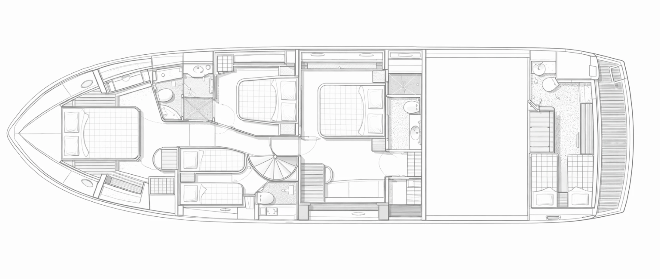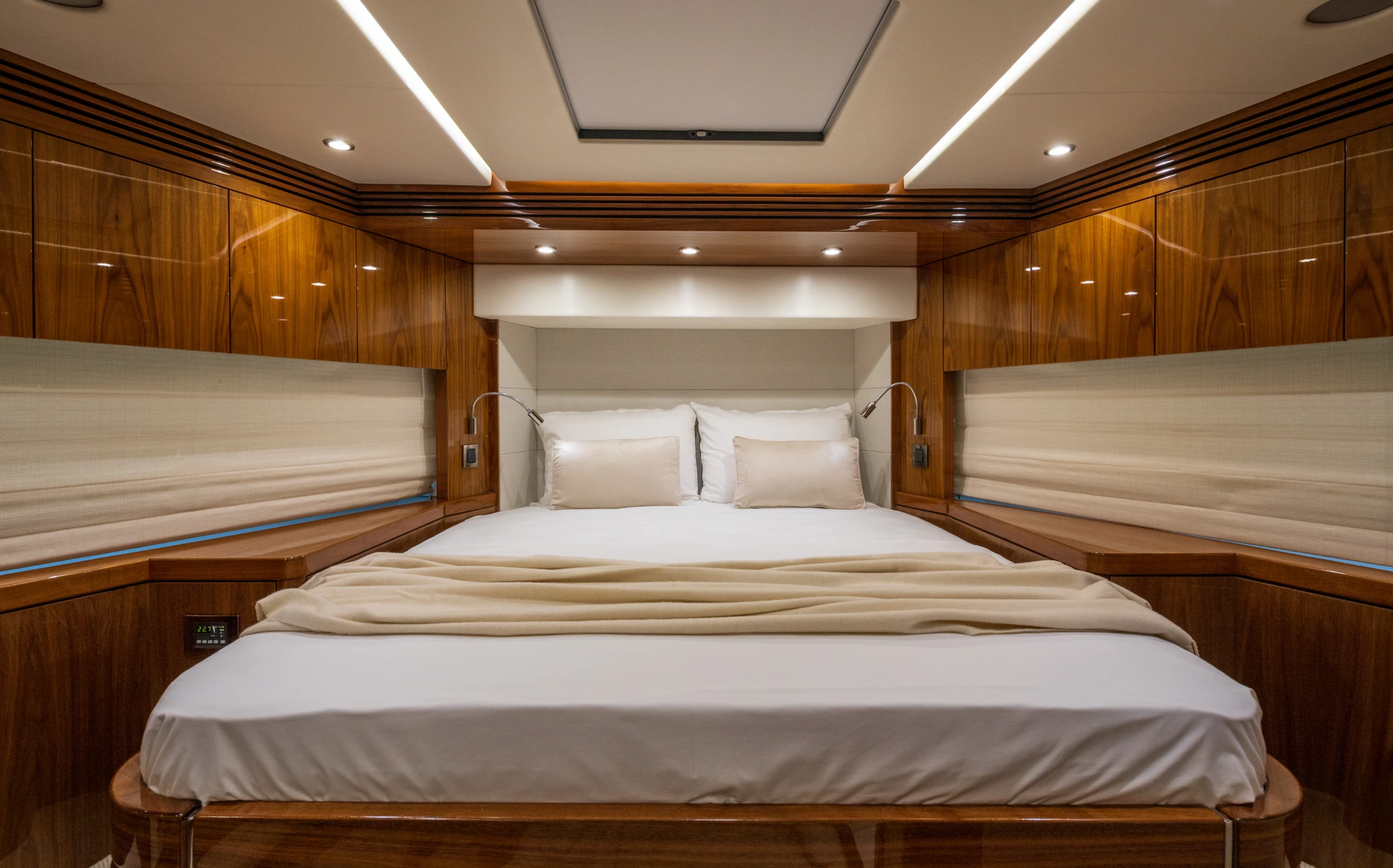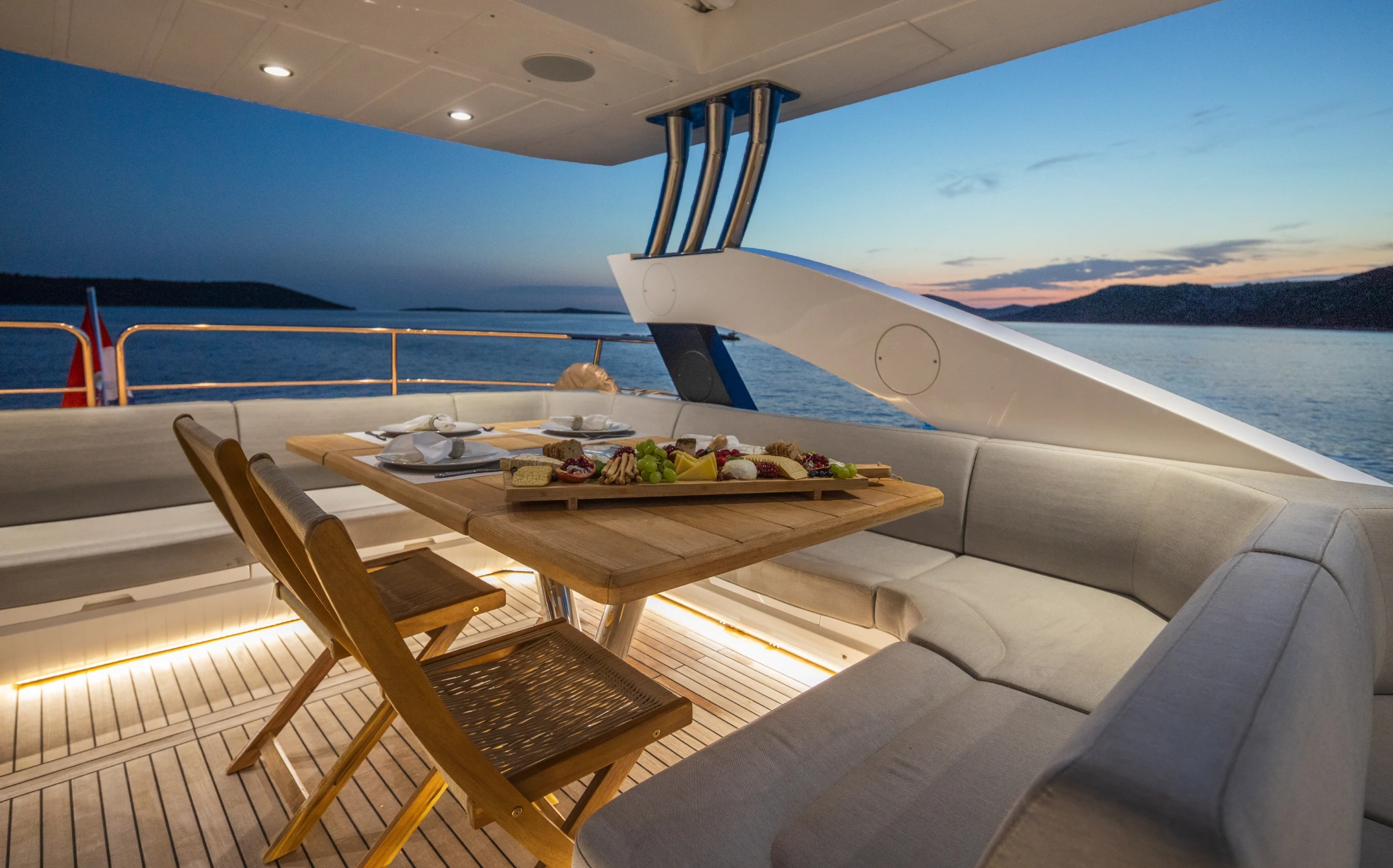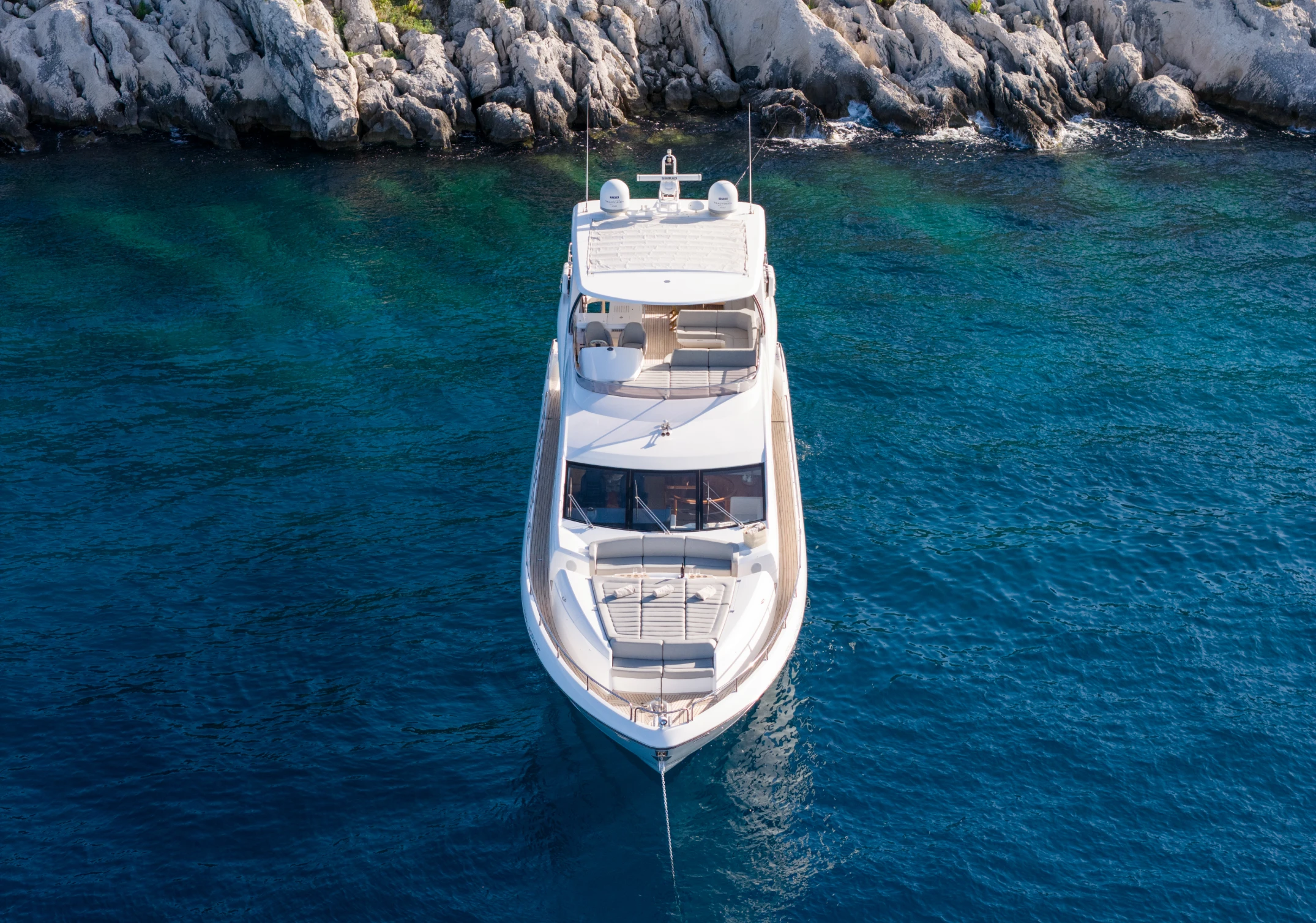 The sound system runs through Sonos across four zones: cockpit, flybridge, foredeck, and saloon. Connect via Spotify, the onboard iPad or your own device. The volume and the playlist are yours.