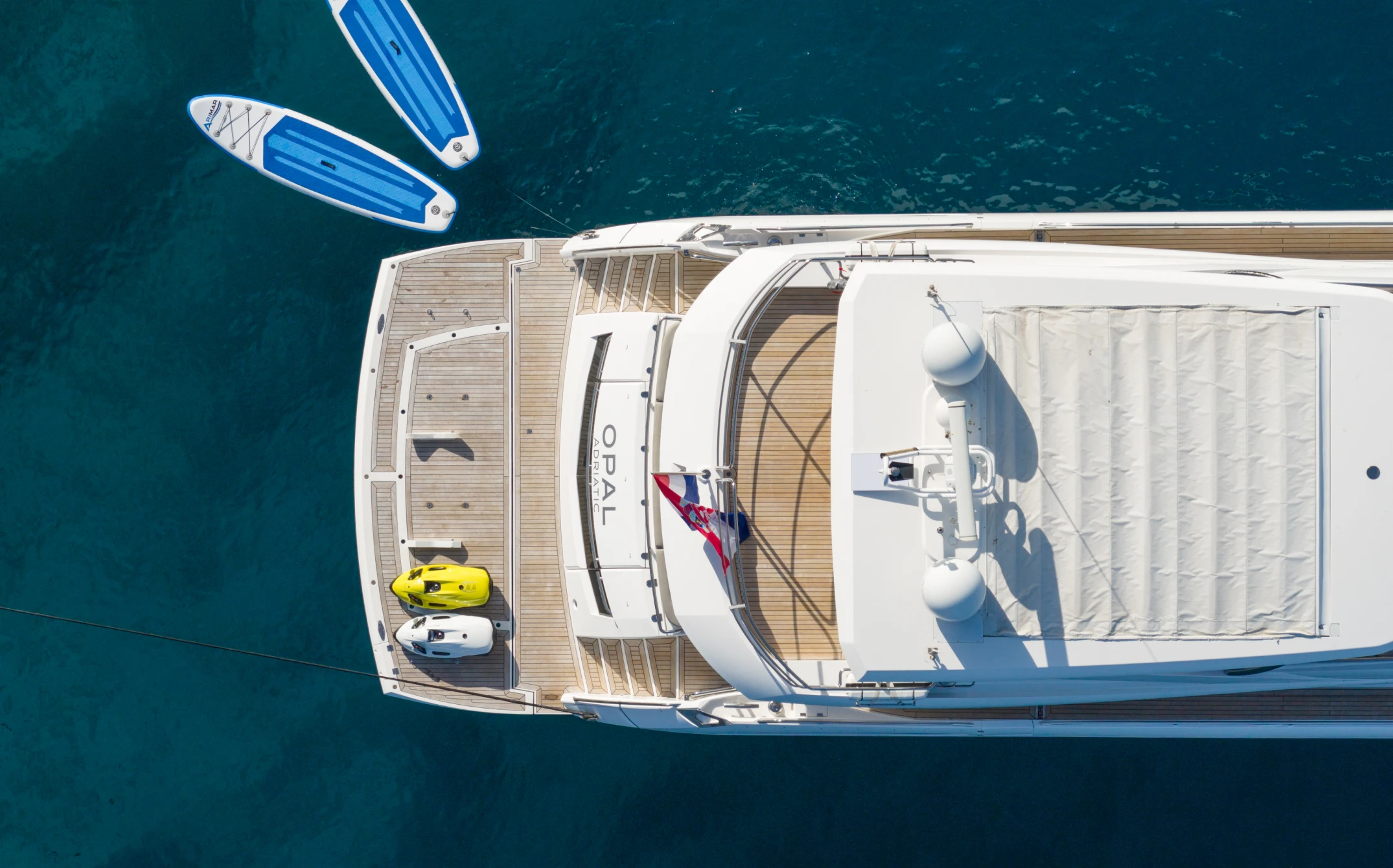 The yacht carries a Williams 385 Turbojet tender for shore excursions and cove-hopping, paddleboards, snorkelling equipment, and sea scooters. If there is something specific you would like on board, let us know during the planning stage and we will do our best to arrange it.
